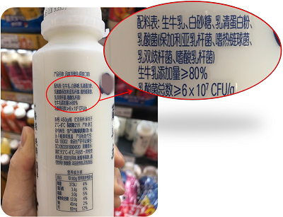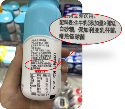 所以,这款标注“复原乳”的风味发酵乳,应该是全部用乳粉生产的,其配料表中应该有乳粉,但没有生牛(羊)乳。看一下它的配料表,是不是我们的分析一致?