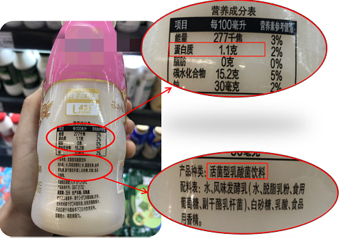 含乳饮料是以乳或乳制品为原料,加入水及适量的辅料经配制或发酵而成的饮料制品,又称为乳(奶)饮料、乳(奶)饮品。像各种标注“活菌型乳酸菌乳饮料”、“活性乳酸菌饮品”、“乳酸菌原味饮品”等带饮料、饮品字样的都不是酸奶。这类产品中虽然也含乳,但蛋白质的含量要比酸奶低的多。国家质量监督检验检疫总局颁发的GB/T 21732-2008 含乳饮料标准中规定,配制型含乳饮料、发酵型含乳饮料的蛋白质含量应≥1.0g/100g,乳酸菌饮料蛋白质含量应≥0.7g/100g,几乎是发酵乳、酸乳(≥2.9g/100g)和风味发酵乳、风味酸乳(≥2.3 g/100g)标准的三分之一。