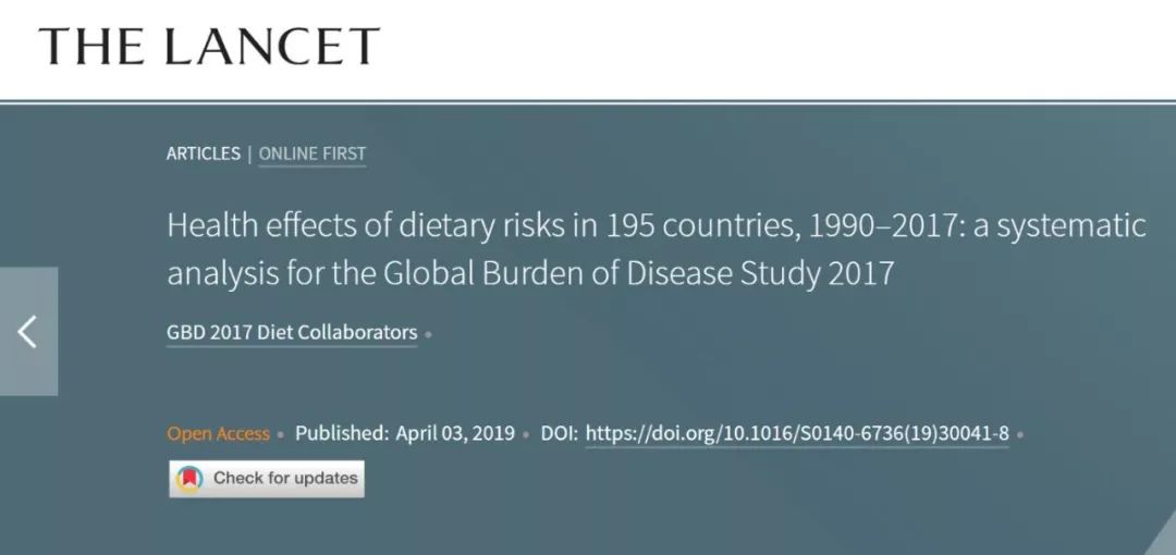 Health effects of dietary risks in 195 countries,1990–2017: a systematic analysis for the Global Burden of Disease Study 2017. DOI:https://doi.org/10.1016/S0140-6736(19)30041-8.