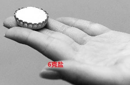 6克盐又是多少呢?大约是一个啤酒瓶盖的量。我们日常所用的可以量度的工具,一般可以用汤勺或茶勺,它们装满细盐,重量大概在 5~8 克。