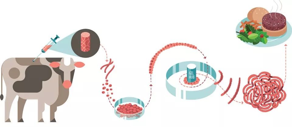 最后将人工培养成的“纤维”附着在海绵状的骨架上进行拉伸,不断刺激肌肉细胞,使其增殖并增加蛋白质的含量。单单一个干细胞就能增殖出8亿条肌肉纤维,这些肉足以制作出8 万个双层吉士汉堡。