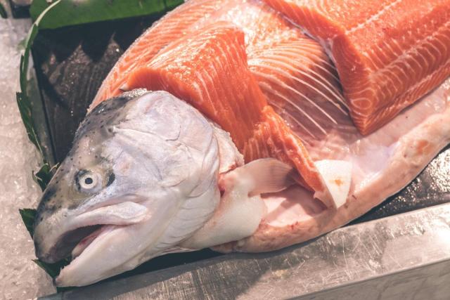 鱼眼和鱼鳃:如果我们能够看到整条的三文鱼,还可以通过鱼眼和鱼鳃来进行判断。新鲜三文鱼的鱼眼清亮,瞳孔颜色很深而且闪亮。鱼鳃色泽鲜红,并且伴有红色黏液。而不新鲜的三文鱼,鱼鳃则会发黑。