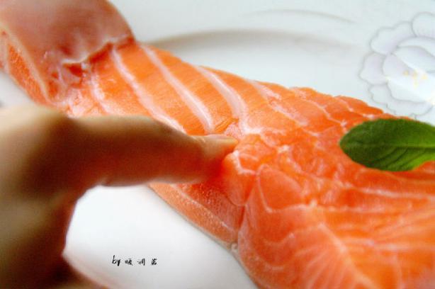 弹性和气味:新鲜(冰鲜)的三文鱼,鱼肉手感紧实,很有弹性,用手指按压后可以迅速的弹回来,不会留下痕迹。闻起来的味道,有着浓郁的鱼油香气和海洋味道,同时带着隐隐的坚果香。而冷冻后再解冻的三文鱼,手感则软塌塌的,肉质松散,用手指按压后,可以看到明显的痕迹,缺乏弹性。稍稍用力挤压时,还可以明显的观察到鱼肉中渗出的水分。闻起来,带着比较明显的鱼腥味,有些令人不快。