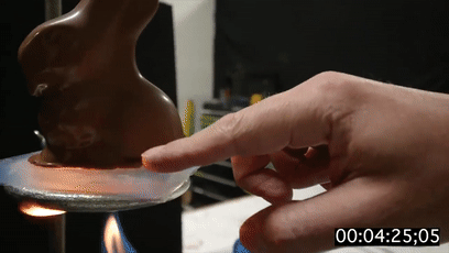 气凝胶还是十分完美的隔热材料,一块兔子形状的巧克力放到气凝胶上,下面用火烤四分多钟都毫无变化,甚至用手触摸气凝胶都感觉不到烫。