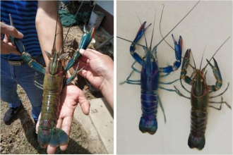 ▲左图为澳洲实地考察的红螯螯虾,右图为相同生长环境下红螯螯虾两种体色的对比,其颜色与性别无关。(图片来源:作者提供)