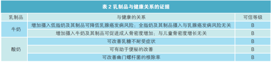 中国营养学会曾组织专家组对乳制品的相关研究进行了搜集,分析了乳制品与健康关系的证据[7]。汇总分析表明摄入低脂奶可降低乳腺癌的发病风险,全脂奶的摄入则与乳腺癌发病风险无关(证据等级B)。