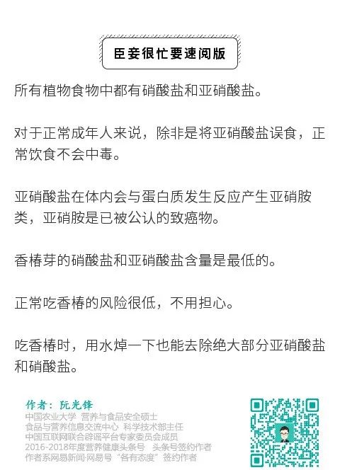 另外,硝酸盐需在特定的条件下才会转化为亚硝酸盐,而香椿内含丰富维生素C,是对亚硝酸盐的形成是有一定阻断作用的,硝酸盐也没那么容易转化成为亚硝酸盐。