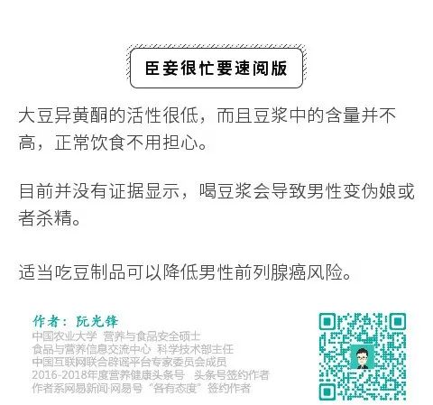 但是,前几天在跟大家聊早餐的时候,有人留言说,看到网上说法称,豆浆中有雌激素,男人不能喝豆浆,男人喝了会出现乳房发育、不长胡子、变娘娘腔等女性化特征;甚至说男人喝豆浆精子数量会减少,杀精,导致不孕不育!问我到底还能不能喝豆浆。