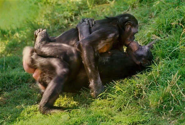 在倭黑猩猩的社会里,性爱不仅仅是为了繁殖后代,还有其他的功能。它们用性来问候对方、表示道歉以及要求获得额外的食物。对于倭黑猩猩群体中的雌性来说,除了自己的子女外,它们会与其他任何同类发生性关系。它们会自慰,相互手淫。这种频繁的交配被认为是为了巩固社会联结,消除彼此的冲突的方式。在解决争端时,倭黑猩猩并不采用暴力方式,而是用性。也因此,性爱不仅存在异性之间,同性也有这种需求。因此可以毫不夸张地说,倭黑猩猩的整个群落都建立在性的基础之上。