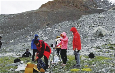 图为小分队在海拔5400米处的甲岗冰川脚下建自动观测站。