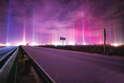 除了国内,在加拿大、俄罗斯、美国、北欧等地也有光柱现身的报道,这都是大气中的冰晶和光源共同作用下的现象,有时候,这个光源可以是太阳,形成壮观的“日柱”景观。