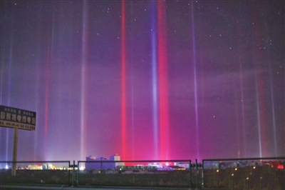 这一次的光柱景象,是在西伯利亚南下的冷气团作用下,青海茶卡当地气温已经降到零下10度以下,晚上空气中的水汽被凝结成冰晶,地面的人造光源就在大气层中形成了壮观的光柱奇观。