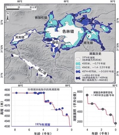 色林错古湖滨线所指示的古大湖变迁。上图为各时期的湖面范围。左下图:色林错古湖滨线高程及其地质年代学样品(蓝色圆圈)指示该湖自4000年以来呈快速、阶梯式退缩。右下图显示色林错古湖自4000年以来的湖面总体变化。