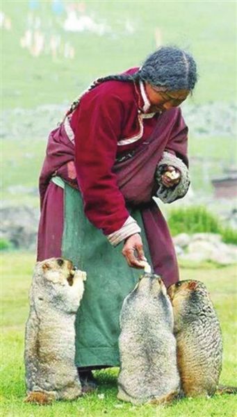 牧民正在给旱獭喂食