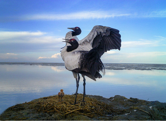 “噢,噢,它把嘴都用上了,啊,终于上巢了,妈妈张开翅膀了,小鹤已经钻到妈妈的翅膀下面去了……”志愿者小胡的最后一句刚说完,杨杰立刻将小胡抱了起来,大家开始欢呼!智华喇嘛像黑颈鹤一样淡定,只是笑笑说,正常的,正常的。