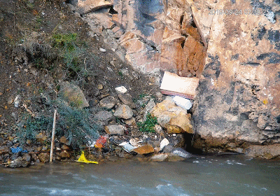 再如,顺河流而下堆积在岸边的垃圾。