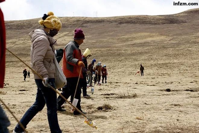 △2014年4月5日,牧民在位于三江源地区的青海甘德县草场上撒药灭鼠。牧民排成横排前进,确保不遗漏鼠洞。图/新华社记者 郭求达