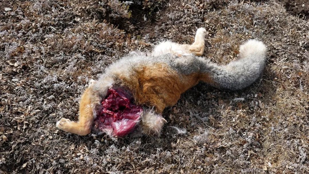 △可能惨死于流浪狗的藏狐(拍摄照片时尊神已经是一具被啃食的尸体了,真正死因不明,但最可能的凶手就是这只狗)。摄/陈怀庆