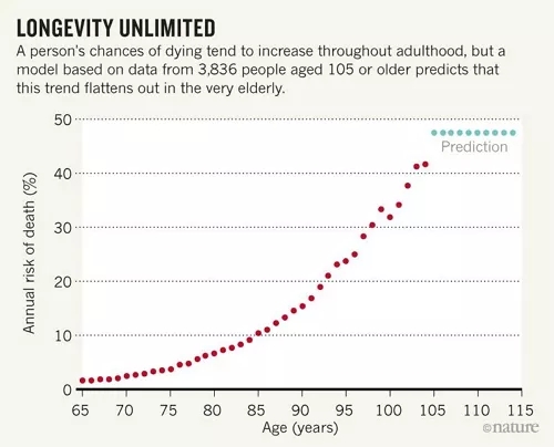 但是对果蝇、线虫等模式动物的研究显示,这些动物表现出了“死亡高原”(mortality plateaus),即死亡率在达到一定高龄后就不再增加了。不过,科学家们却很难在人类身上验证“死亡高原”的存在,部分原因是很难获得“超级老人”的准确数据。
