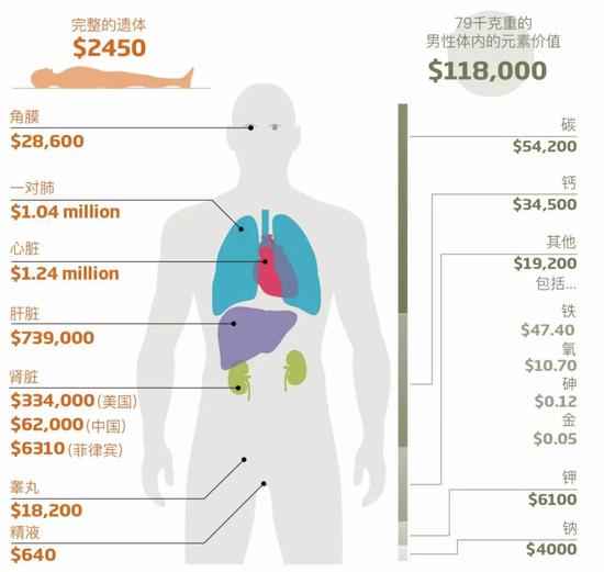 在讨论你的生命值多少钱之前,让我们先来看另一个较为直接的问题:你的身体本身值多少钱?从用于医学研究的遗体,到器官移植,再到体内所含的元素,我们有可能估算出每一项的数值。(注:图中各元素的价值,来自该元素的高水平补充剂的价格)