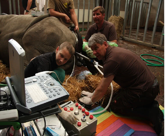 研究人员正在从一头雌性南方白犀牛体内采集卵子。图片来源:NATURE COMMUNICATIONS