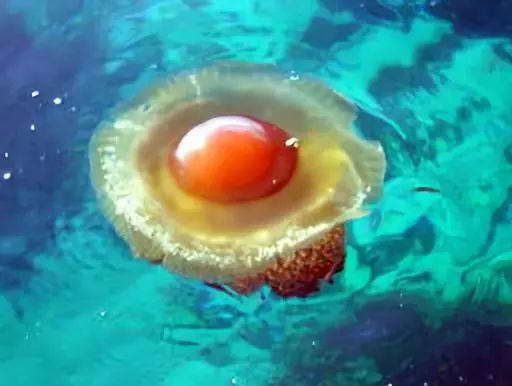 主要分布在地中海地区的蛋黄水母,会让人觉得造物主又调皮了,因为它看上去就像是一个打碎的蛋,如果不是35-50厘米的大块头,一定会让很多人或动物误会。
