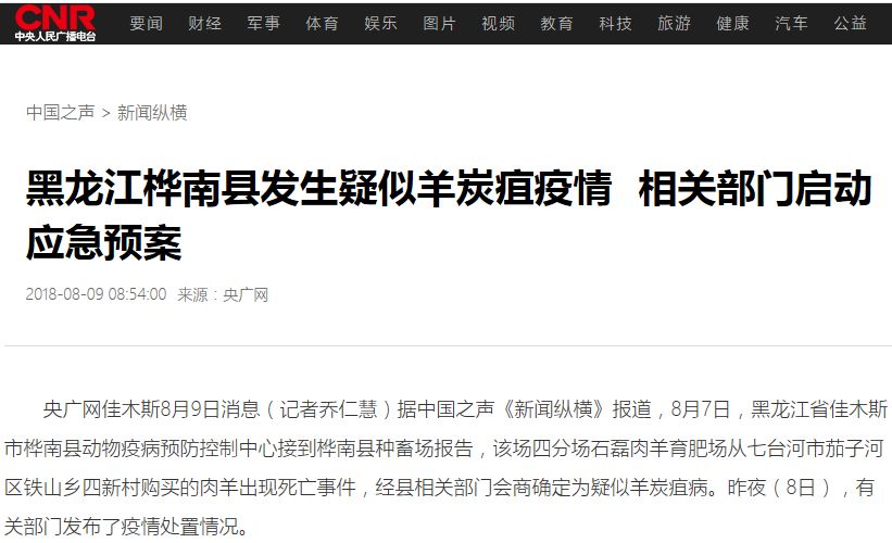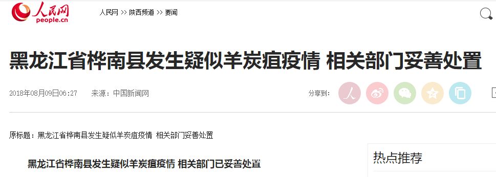 8月7号,黑龙江省佳木斯市桦南县动物疫病预防控制中心接到桦南种畜场报告,该场四分场石磊肉羊育肥场从七台河市茄子河区铁山乡四新村购买的肉羊出现死亡事件,经县相关部门会商确定为疑似羊炭疽病。8日晚上,有关部门发布了疫情处置情况。