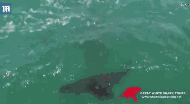 真实的巨齿鲨现在谁也没见过活的,那只好来看看和它类似,但身形小了好几圈的大白鲨的表演吧!
