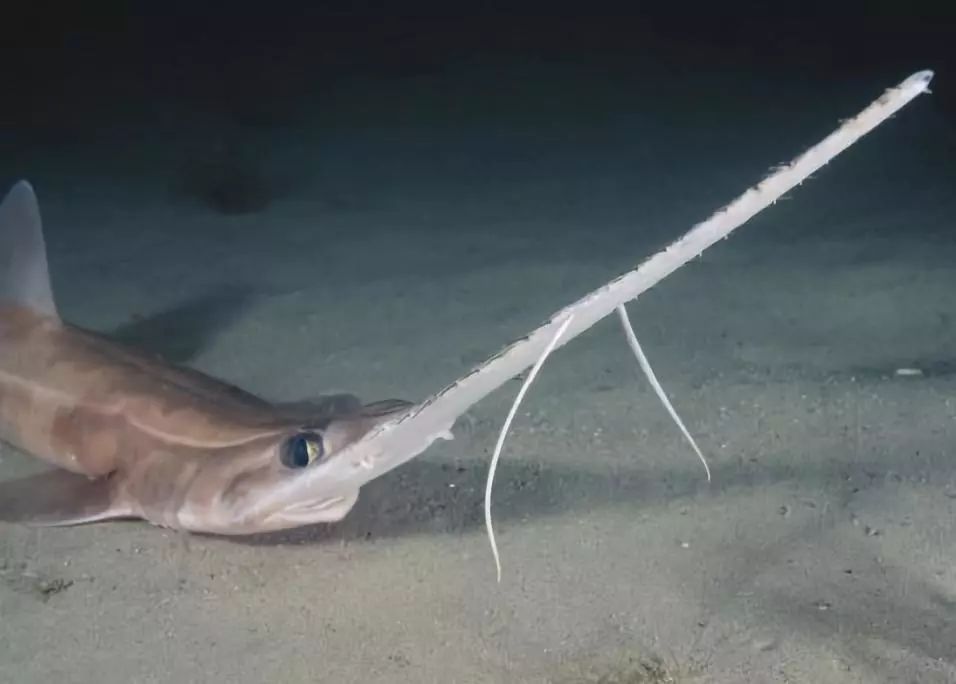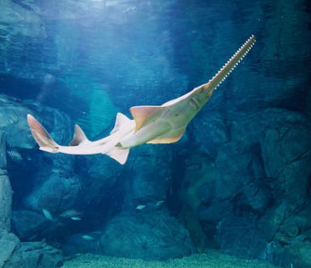 另一种和鲨鱼关系很近的软骨鱼——鳐鱼家族中倒是有一名真正的竖锯杀人狂,锯鳐。最大可以长到7.6米,吻部占体长的三分之一,体格看上去像鲨鱼,只是它的嘴巴出卖了它。在捕猎的时候,它会疯狂挥动头部,将面前的鱼类斩断。你问我如果鱼块挂到锯齿上咋办?锯鳐自己也在头疼这个问题,不过鱼块还好,它们的锯齿还经常挂在渔网上,这可就要命了。因此它们目前也变成了珍稀动物。