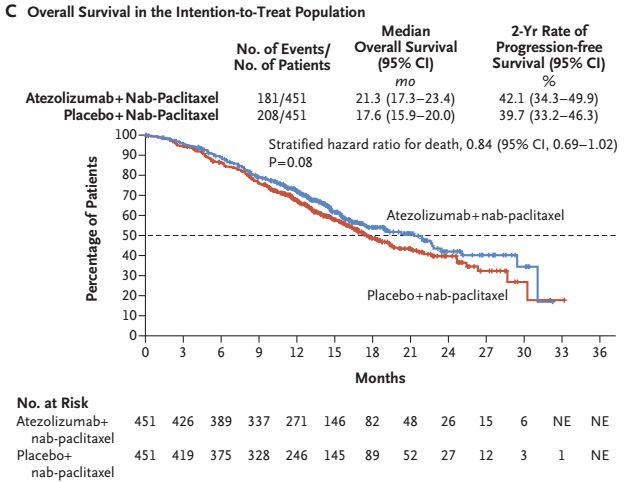 而这次,正是Atezolizumab和白蛋白结合型紫杉醇联用的一个临床Ⅲ期试验,以白蛋白结合型紫杉醇和安慰剂作为对照。两个主要疗效终点是患者的无进展生存期和总生存期。