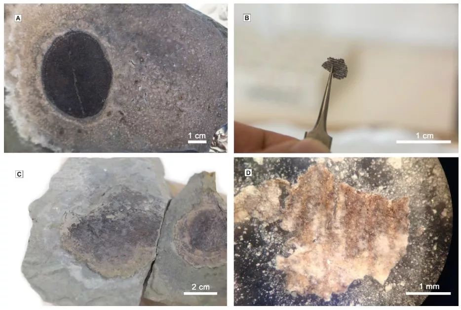 左图中的黑块是用酸处理过的狄更逊水母化石。右图镊子夹起的就是一小片狄更逊水母有机质。图片来源:参考文献[1]