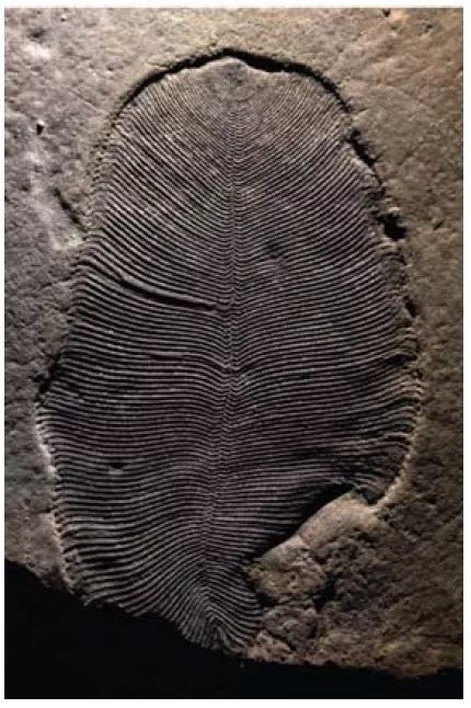 这片“芭蕉叶”就是狄更逊水母的化石,内含有机分子,宽度约5.5cm。 图片来源:参考文献[1]