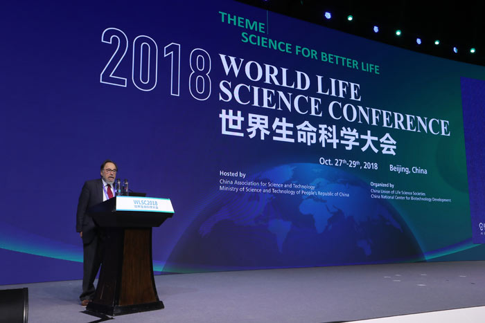 2018年10月27日-29日,2018世界生命科学大会在北京国家会议中心举办。图为1975年诺贝尔生理学或医学奖获得者、美国加州理工学院生物学教授戴维·巴尔的摩(David Baltimore)在开幕式上致辞。(科协供图)