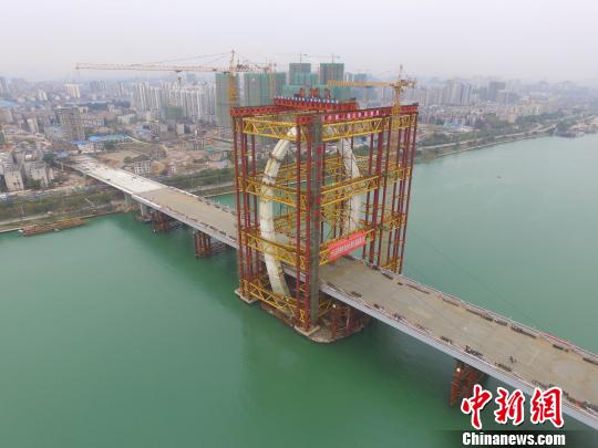 12日,目前世界上跨度最大的“反对称结构斜拉桥”广西柳州市白沙大桥主塔在106米高空合龙,该大桥建设正式进入最后阶段。