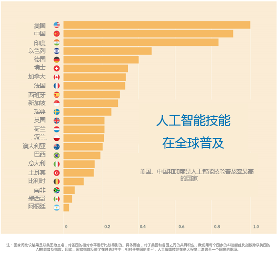 人工智能技术在全球的普及程度非常高,美国、中国、印度、以色列和德国是职业人群中人工智能相关技能普及率最高的国家。