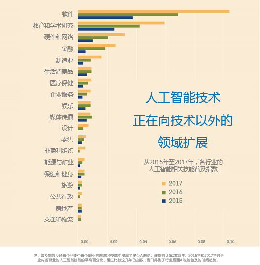 随着社会文化、品味的变化和新技术的产生,行业和职业也在相应演变。观察不同工作的技能需求如何变化是衡量行业和职业演变情况的方法之一。这些变化在各工种和行业中各有展现,通过对比各行业从业人员2015年拥有的技能与2017年拥有的技能的变化,不难发现从业人员拥有最多人工智能相关技能的行业也是变化最快的行业。如果将“变化”视为创新的代名词,这说明人工智能相关技能与行业内的创新高度相关,也意味着很多行业可以加大对人工智能相关技能的投资。
