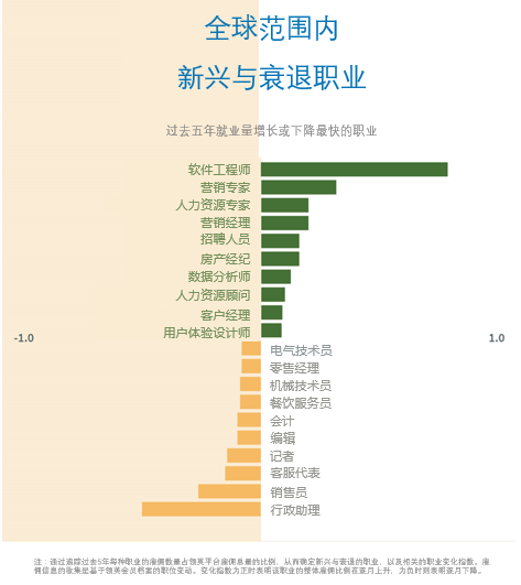世界经济论坛发布的《未来就业报告》指出,前十大新兴职业(即过去五年就业量增长最快的职业)包含多个以人为中心的职业。纵观全球各个行业,排名靠前的新兴职业包括营销专家和经理、人力资源专家和顾问、用户体验设计师。这些职业要求从业者了解人类行为和偏好,所涉及的技能基本上无法实现自动化。