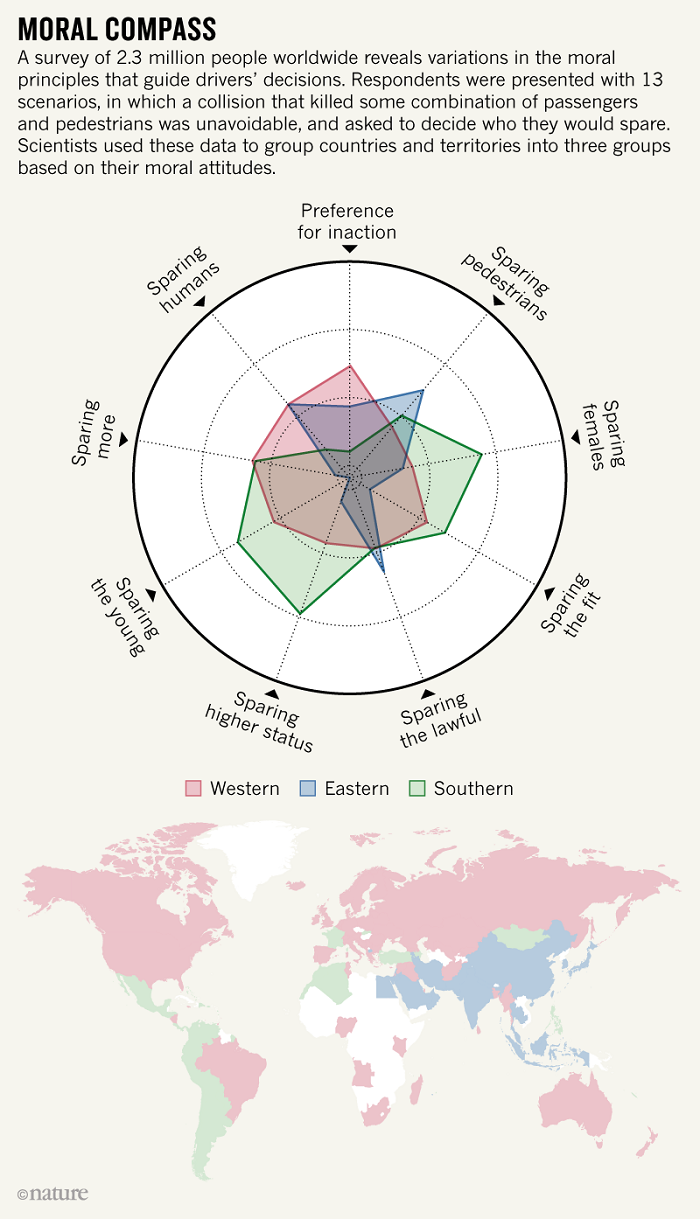 在芬兰和日本等相对发达的国家和地区,受访者普遍认为应该撞向违反交通规则的那帮人。但在经济发展极不平衡的哥伦比亚,旁观者又觉得应该撞死一个流浪汉、而不是一位企业高管。