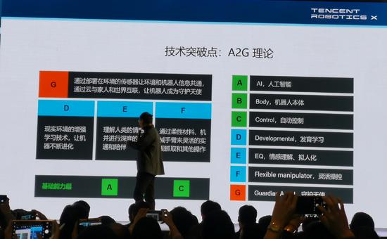 对于智能机器人的技术突破点,张正友提出了“A2G理论”,其中A代表人工智能,B代表机器人本体,C代表自动控制,ABC构成机器人的基础能力层;D代表发育学习,E代表EQ,F代表灵活操控,DEF代表机器人的智能化水平,G代表守护天使,即机器人最终的目的是要服务于人,包括增强人的智力、体力等等。