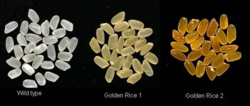 黄金大米,又名“金色大米”,是一种转基因大米,通过转基因技术将胡萝卜素转化酶系统转入到大米胚乳中可获得外表为金黄色的转基因大米,被称为“黄金大米”,英文为Golden Rice。富含胡萝卜素,富含维生素A ,由美国先正达公司研发。其优于正常大米的主要功能为帮助人体增加维生素A吸收。因为色泽发黄,该大米品种被称为“黄金大米”。质疑者认为黄金大米可能会严重威胁到环境和粮食安全,它也并不能解决造成维生素A缺乏症的根本原因——贫困和缺乏多样化的饮食。