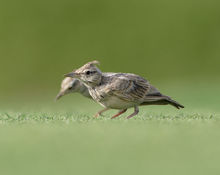 百灵是草原的代表性鸟类,属于小型鸣禽。它们的头上常有漂亮的具羽冠,嘴较细小而呈圆锥状,有些种类长而稍弯曲。鼻孔上常有悬羽掩盖。翅膀稍尖长,尾较翅为短,跗跖后缘较钝,具有盾状鳞,后爪又长又直。我国常见的种类有沙百灵、云雀、角百灵、小沙百灵、斑百灵、歌百灵和蒙古百灵等。沙百灵与云雀能从地面拔地而起,直冲云霄,在空中保持着上、下、前、后力的平衡,悬翔于一点鸣唱。角百灵常常悄悄地在地上奔跑,或站在高处窥视周围的动静,行动较为诡秘。凤头百灵因头顶有一簇直立成单角状的黑色长羽构成的羽冠而得名,它生性大方,喜欢在道路上觅食,旁若无人。雌鸟在孵卵时也不像其他鸟类那样容易惊飞。