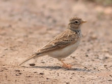 百灵成鸟体长约190mm。体重约30g。雄鸟额部、头顶及后颈部均为栗红色;眼前、眼周及眉纹为棕白色,左右两侧眉纹延伸至枕部相接而现棕色;背、腰栗褐色;翅羽黑褐色;尾羽栗褐色,最外侧尾羽色淡近于白色;额、喉白色,上胸左右侧各有一黑色条斑,于上胸部相接;下体大部羽色棕白。