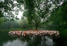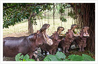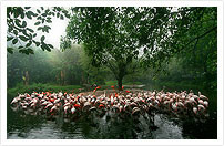 在游览车的右侧,可以看到许多头白犀牛。和白犀牛做邻居的是大嘴先生——河马,要想看到河马上岸可真不容易,它们白天的绝大部分时间都是在水中度过的,相貌古怪的鞍嘴鹳有时就“坐”在河马的背上休息。而在游览车的左侧,则有大群的白尾角马、大羚羊、南非剑羚、屁股上有个白圈的水羚以及重量级的中国三大国宝之一——金毛羚牛。一旁的水塘中,同是身穿白色大衣的鹈鹕与白天鹅在同一个湖里和谐共处。