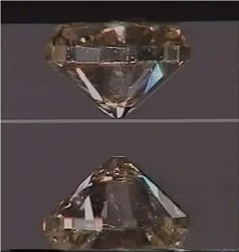 图1. 金刚石对顶砧,由两块加工成近似锥状的金刚石组成。加在较大面积的底部上有限的力会在面积较小的顶部(对顶到一起)形成很大的压强。