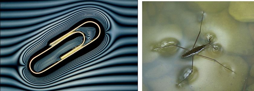 图2:水的表面张力(75.6mJ/m2)足以托起一根曲别针(左图,Robert Anderson的摄影作品)。许多生物,如水黾,就是靠水的表面张力而从容地浮在水面上的(右图)。