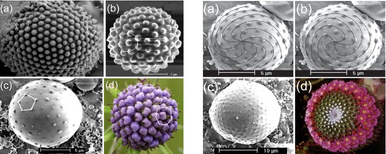 应力水平过高(overstressed)的体系会失稳,过渡到一个应力非均匀的但总形变能最小化的状态。龟裂的大地,人脸上的皱纹[5],甚至花叶序,可能都是寻求弹性形变能最小的结果。既然应力水平过高的体系会失稳,导致自组装花样的出现,它就可以用来制备各种有序花样。应力工程目前在此方向上取得了许多傲人的成绩,被誉为是微纳米制作的第三条途径。不过,stress 不像电场或磁场那样可以作为外部条件随意添加。欲在一个体系内引入给定分布的应力场,说着简单,要想实现却是非常困难的。但是利用热效应,是有可能在体系内,尤其是在微观体系内,产生一个均匀的应力场的。自2004年以来,李超荣教授和笔者合作,在Ag内核/SiO2壳层微结构上通过冷却在壳层内引入过量的应力,在球面的结构上观察到了三角铺排的应力点阵,在锥面的结构上观察到了左手性和右手性的7组菲波纳契螺旋状的应力点阵(图4)[6-8],New Scientists 杂志欢呼这是人类第一次在微观层次上制备出菲波纳契螺旋。这些结果为验证花叶序作为最小弹性能构型的力学原理提供了坚实的实验依据。此后,基于对此原理的理解,我们同其他合作者一道,通过模拟计算证实,大自然中的多种瓜果的外观花样是应力屈曲模式在由形状因子、果皮厚度和应力过载构成的参数空间中不同域(domain)上的表现 (图5)。