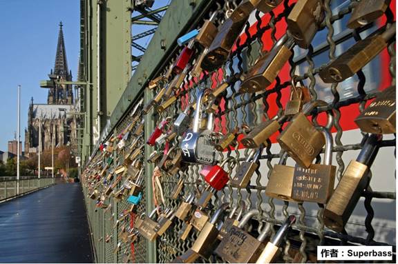 锁具不仅满足人们的安全需求,在发展中还演化出了文化意义,图为德国一座大桥上的同心锁。看来全世界的恋人们都相信,相爱的人挂上同心锁就能和对方生生世世永结同心。