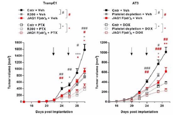 研究人员将化疗药物紫杉醇(PTX)或阿霉素(DOX)分别与GPVI抗体联用,或者单独使用,处理肿瘤小鼠。一段时间后,检测发现与GPVI抗体联用的小鼠肿瘤组织中,化疗药的浓度更高。而且,只用化疗治疗的小鼠肿瘤下降了50%-60%,而联用组小鼠肿瘤的体积下降了70%-80%。表明抑制GPVI受体,可以提高化疗药物的抗肿瘤能力。