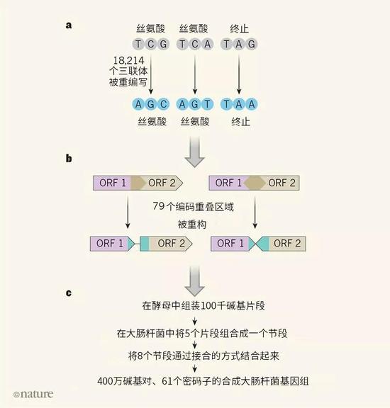 a.Fredens等人对大肠杆菌基因组的3个碱基三联体(密码子)进行了重编写,将编码丝氨酸的TCG和TCA和代表蛋白编码序列终止的终止密码子TAG替换成具有相同功能的密码子AGC、AGT和TAA。