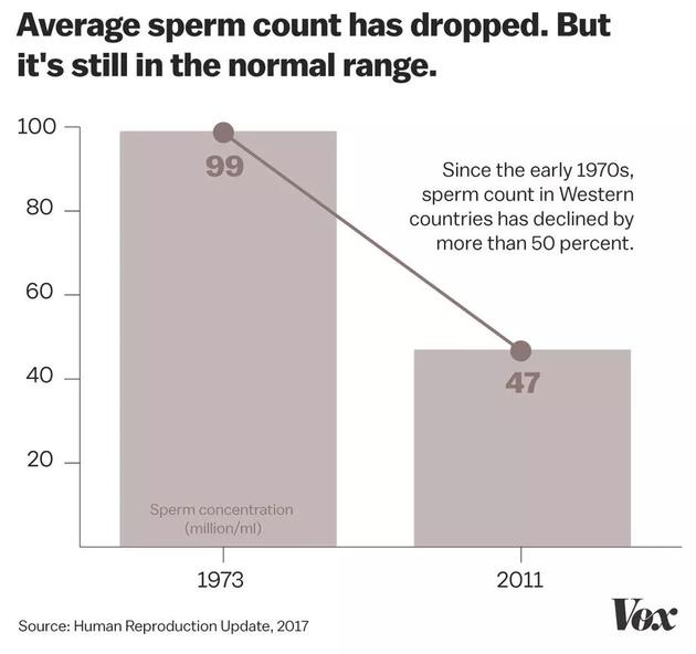 2017年发表在《人类生殖动态》期刊的一项研究提出了该问题的最权威解释,该研究报告引起了人们的关注:自70年代以来西方国家男性精液中精子浓度(也被称为精子数量)减少一半,但随后人们开始淡忘这项研究报告,因为尽管精子数量大幅减少,但仍在正常精子数量范围之内。